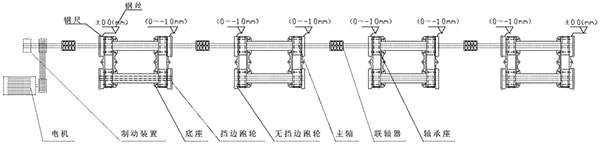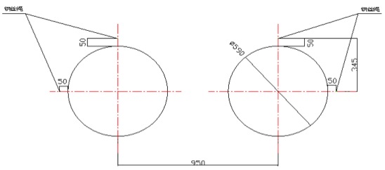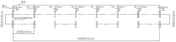 第二次調(diào)整:①卸下全部的夾軸器,按照以上粗調(diào)的步驟來精調(diào)離心機的水平精度;②調(diào)整要求:水平方向,調(diào)整主、從動輪軸承座旁的調(diào)節(jié)螺釘使主動軸與副軸中心線在同一水平面上間距為950mm,兩端的寬度差(平行度)≦±0.5mm;垂直方向各輪的水平度誤差±1mm,前后輪略高0.5mm;調(diào)整各組跑輪使長度方向中心距為2000mm±1mm,總托輪距累積誤差≦±2mm。③帶擋邊主、副輪與模具接觸面要對應(yīng)對齊,調(diào)整后要鎖緊,防止工作時移位(圖示一);④底部的墊鐵、斜鐵要打緊,緊定好螺母,重新裝好夾軸器,進行第二次灌漿。