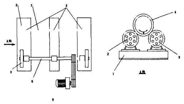 1、底座;2、被動(dòng)托輪;3、主動(dòng)托輪;4、鋼模板;5、軸承座;6、主動(dòng)軸;7、被動(dòng)軸;8、調(diào)速電機(jī);